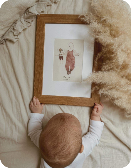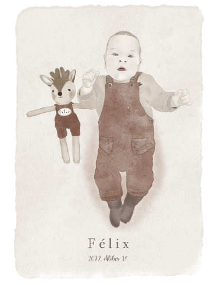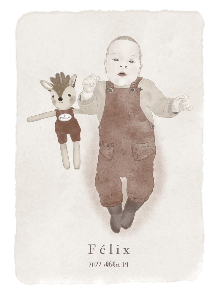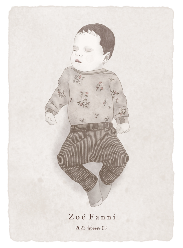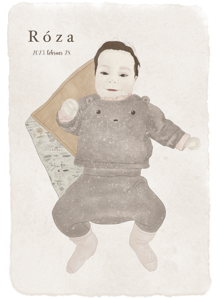 - Lehetőséged van kérni, hogy a portréra egyedi elemek is rákerüljenek, pl: babád kedvenc játéka, takarója vagy bármi egyéb apróság, de ezen tárgyak portréra komponálása már pluszköltséggel jár.