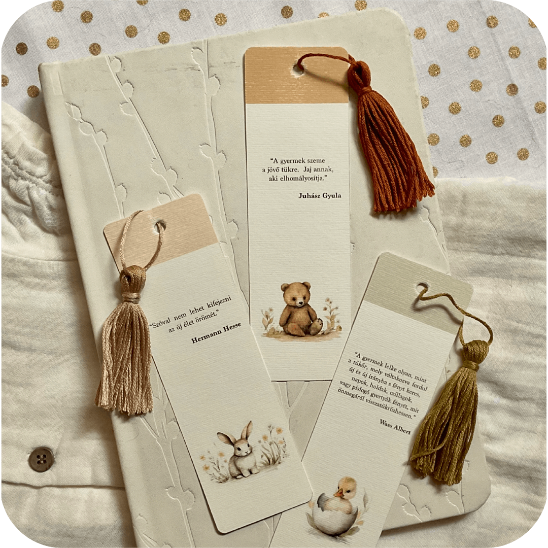 Ha az esti meséléskor szeretnéd elkerülni az ismétlést jó szívvel ajánlom a kézzel készült egyedi könyvjelzőimet, hat változatban érhető el, mindegyiket  színes fonal bojt díszíti és egy bölcs idézet is olvasható rajtuk.
